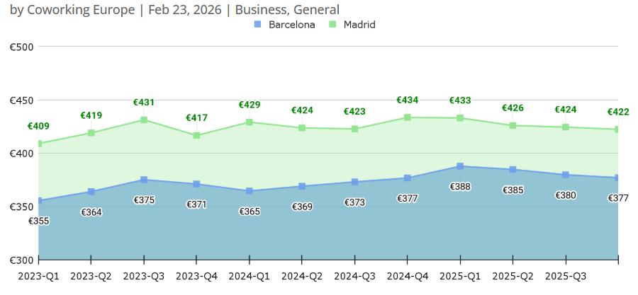 El crecimiento del coworking en Madrid no es una tendencia pasajera ni un efecto rebote postpandemia. Es una transformación estructural del mercado inmobiliario terciario. Según un reciente informe publicado por Coworking Europe en febrero de 2026 , el stock de oficinas flexibles en Madrid y Barcelona creció un 26% en 2025, con la apertura de 22 nuevos centros que añadieron casi 59.000 metros cuadrados al mercado. Madrid lideró esa expansión con 15 nuevas aperturas y cerca de 39.000 metros cuadrados adicionales.