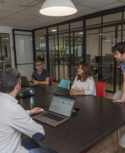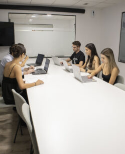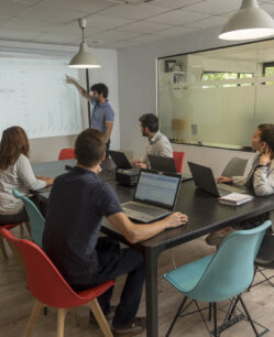 con pizarras, pantallas y con mobiliario ergonómico para reuniones cómodas y funcionales.